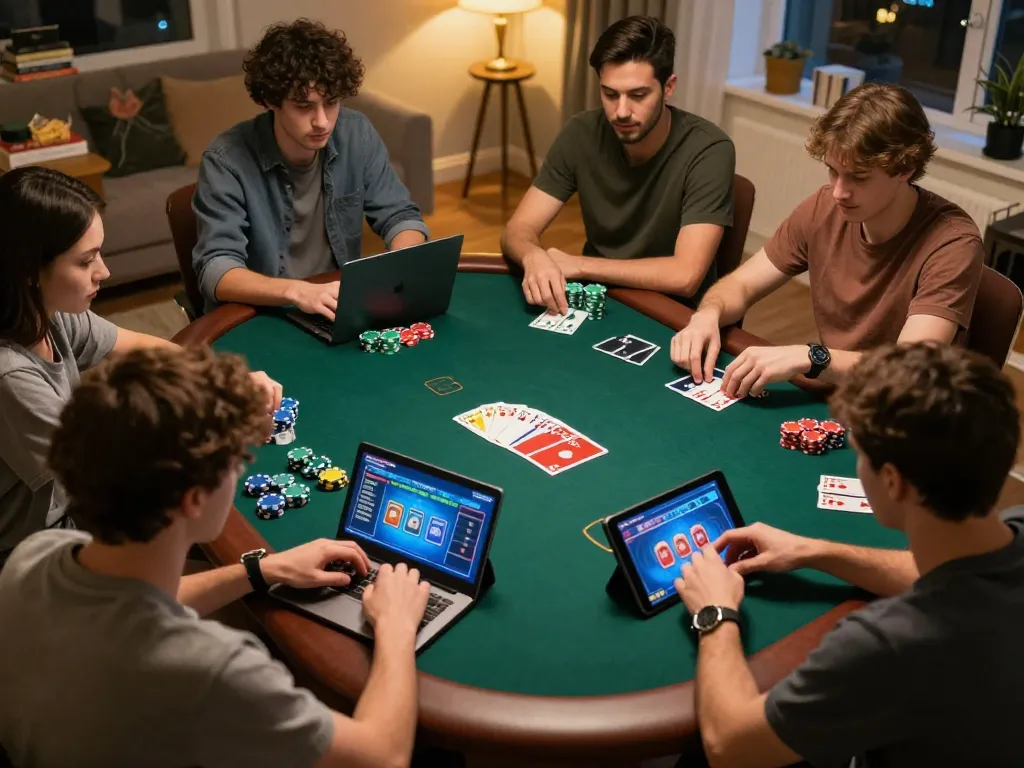 Players engaging in online poker game at home, showcasing strategies on 23win com, with focused expressions and colorful game visuals.