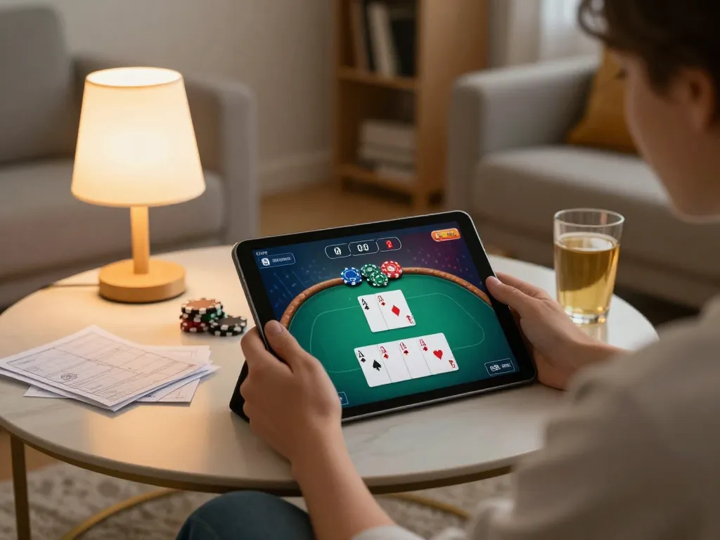Engaging online poker gameplay at home using https://shbet.id/ tablet with cozy surroundings.